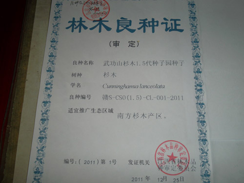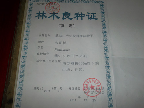 2011年11月30日由江西省林木品种审定委员会审定通过的"武功山杉木1.5代种子园种子"和"武功山火炬松母树林种子"已经录入江西省林木良种名录名单